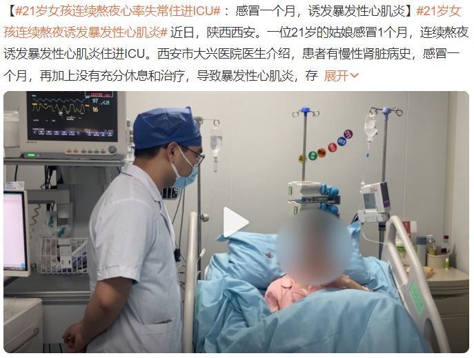 ◎ 陕西西安,一位21岁的女孩赓续熬夜诱发暴发性心肌炎住进了ICU。