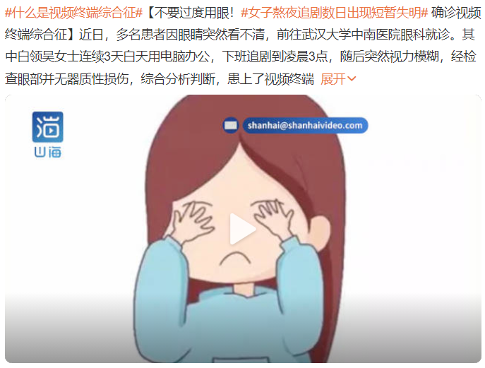 ◎ 湖北武汉,吴女士在赓续3天白日用电脑办公,放工追剧到凌晨3点后,短暂眼光朦胧,患上了视频末端概述征。经由药物调理和与电子屏幕透顶远离5天后,眼光才收复普通。